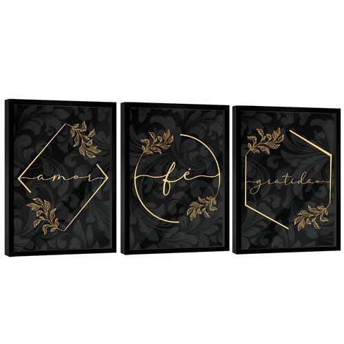 Quadro Decorativo Trio Gratidão, Fé e Amor Moldura Preta e Vidro - 180x105cm -