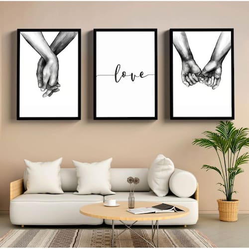 Deixe seu ambiente mais agradável com o Trio de Quadros Decorativos Love Mãos Dadas em preto e branco. Os quadros além de serem muito bonitos são de alta qualidade. Dê adeus para as paredes vazias e monótonas. Os quadros decorativos são grandes aliados quando o assunto é decoração, suas cores irão trazer mais sofisticação para a sua sala, quarto, escritório, ou qualquer outro ambiente. Cada quadro é produzido em adesivo impresso, aplicado em MDF de 3mm e acompanha moldura em madeira de reflorestamento. Para deixar as peças perfeitas na sua parede, é aconselhável que disponha os três um ao lado do outro com um pequeno espaço entre cada um deixando todos na mesma altura, com isso, você terá um resultado fantástico. O quadro se encaixa bem em qualquer ambiente, com sofisticação e design moderno esse quadro é a peça chave para tornar seu ambiente mais aconchegante. Características: - 3 quadros com tamanho total de de 40x60cm cada - Acompanha moldura - Fundo em MDF 3mm - Produzido em adesivo impresso - Moldura produzida em madeira de reflorestamento - Não acompanha vidro Especificações Técnicas: Produto: Quadro decorativo Marca: Impakto Visual Quantidade: 3 peças Material: Adesivo Moldura: Madeira de reflorestamento Tamanho total: 40 x 60 cm Medidas da moldura: 2 x 1 cm Profundidade: 1cm Cor predominante: Branco e Preto Cor da moldura: Preto Modelo: Love Mãos Dadas Conteúdo da embalagem: 3 quadros