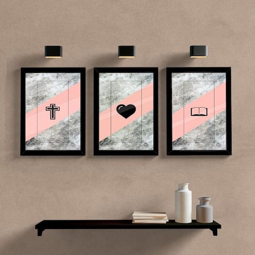 Descrição do produto: Transforme seu ambiente com este inspirador quadro decorativo triplo, composto por três peças que simbolizam fé, amor e sabedoria. Com uma moldura elegante e vidro protetor, cada peça de 33x25 cm (tamanho A4) é perfeita para trazer uma mensagem de esperança e espiritualidade para sua casa, escritório ou espaço de meditação. Benefícios: Durabilidade: Moldura resistente e vidro que protege contra poeira e danos Estilo: Adiciona um toque de espiritualidade e beleza ao seu espaço Facilidade: Pronto para pendurar, sem necessidade de montagem Características:03 Peça(s)Com vidro.Moldura feita de madeira maciça disponíveis nas cores:Preta, Branca, Rosa e Azul TurquesaImagem A4 de alta qualidade protegida contra umidade.Dimensões por peça:Moldura: 25 cm L. 33,7 cm AlturaImagem: 21 cm L. 30 cm AlturaVidro: 0,3 mm Espessura.