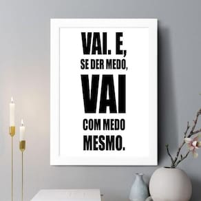 Quadro decorativo vai e se der medo 33x24cm Cor: moldura branca Informações do produto tire todas as suas dúvidas no descritivo abaixo: decoração para quarto, sala, cozinha, escritório, área gourmet e muito mais. Chega de paredes vazias medidas - cada peça tem 33x24cm a4 . Material do papel - papel fotográfico brilhante de altíssima resolução acabamento - todos os quadros são acompanhados de uma película de acetato para proteção da imagem. - os quadros são embalados de forma segura com plástico bolha com camada dupla de acordo com o tamanho dos quadros. - de 3 meses. Meu quadro chegou. Como posso fixá-lo Você precisa apenas de um martelo e um prego, pois os quadros já vão acompanhados de penduradores. Esta é a forma mais indicada. Caso prefira, você pode utilizar uma fita dupla face neste caso, sugerimos de alta qualidade para evitar que descole e seu quadro caia . Como posso limpar meu quadro A limpeza é feita como um móvel comum da sua casa. Apenas um pano seco ou espanador são suficientes para tal Marca: Não Informado