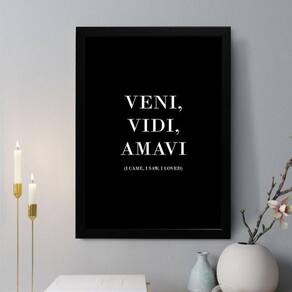 Quadro decorativo veni vidi amavi 45x34cm - com vidro Cor: moldura preta Informações do produto tire todas as suas dúvidas no descritivo abaixo: decoração para quarto, sala, cozinha, escritório, área gourmet e muito mais. Chega de paredes vazias medidas - cada peça tem 45x34cm a3 . Material do papel - papel fotográfico brilhante de altíssima resolução acabamento - todos os quadros são acompanhados de vidro para proteção da imagem. - moldura em madeira maciça na cor preta ou branca conforme produto escolhido e pendurador . - os quadros são embalados de forma segura com plástico bolha com camada dupla de acordo com o tamanho dos quadros. Garantia - garantia de 3 meses. Meu quadro chegou. Como posso fixá-lo Você precisa apenas de um martelo e um prego, pois os quadros já vão acompanhados de penduradores. Esta é a forma mais indicada. Como posso limpar meu quadro A limpeza é feita como um móvel comum da sua casa. Apenas um pano seco ou espanador são suficientes para tal