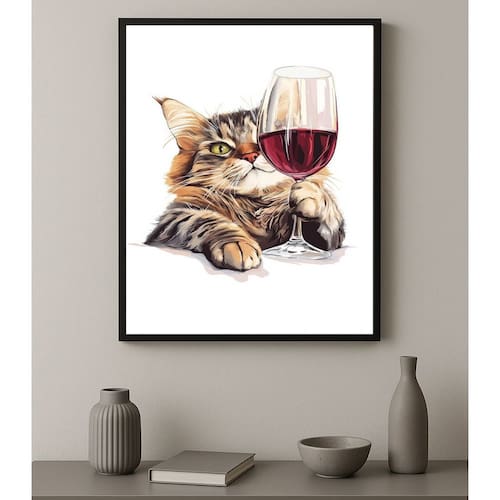 Quadro Decorativo Vinho - Gato Com Taça 33x24cm - Cor: Moldura branca