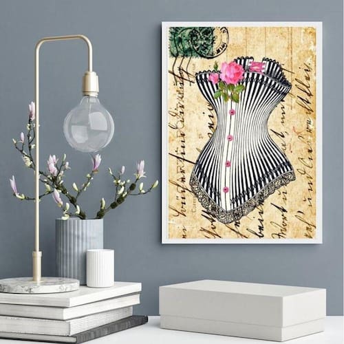 Quadro decorativo vintage corpete 45x34cm - com vidro Moldura: madeira preta Informações do produto tire todas as suas dúvidas no descritivo abaixo: decoração para quarto, sala, cozinha, escritório, área gourmet e muito mais. Chega de paredes vazias medidas - cada peça tem 45x34cm a3 . Material do papel - papel fotográfico brilhante de altíssima resolução acabamento - todos os quadros são acompanhados de vidro para proteção da imagem. - moldura em madeira maciça na cor preta ou branca conforme produto escolhido e pendurador . - os quadros são embalados de forma segura com plástico bolha com camada dupla de acordo com o tamanho dos quadros. Garantia - garantia de 3 meses. Meu quadro chegou. Como posso fixá-lo Você precisa apenas de um martelo e um prego, pois os quadros já vão acompanhados de penduradores. Esta é a forma mais indicada. Como posso limpar meu quadro A limpeza é feita como um móvel comum da sua casa. Apenas um pano seco ou espanador são suficientes para tal Ean: 7895266647617