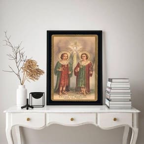 Quadro decorativo vintage são cosme e damião 45x34cm - com vidro Moldura: madeira preta Informações do produto tire todas as suas dúvidas no descritivo abaixo: decoração para quarto, sala, cozinha, escritório, área gourmet e muito mais. Chega de paredes vazias medidas - cada peça tem 45x34cm a3 . Material do papel - papel fotográfico brilhante de altíssima resolução acabamento - todos os quadros são acompanhados de vidro para proteção da imagem. - moldura em madeira maciça na cor preta e pendurador . - os quadros são embalados de forma segura com plástico bolha com camada dupla de acordo com o tamanho dos quadros. Garantia - garantia de 3 meses. Meu quadro chegou. Como posso fixá-lo Você precisa apenas de um martelo e um prego, pois os quadros já vão acompanhados de penduradores. Esta é a forma mais indicada. Como posso limpar meu quadro A limpeza é feita como um móvel comum da sua casa. Apenas um pano seco ou espanador são suficientes para tal Ean: 7892218842793