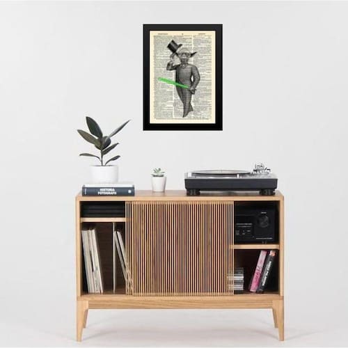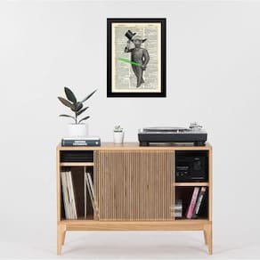 Quadro decorativo vintage yoda 45x34cm - com vidro Moldura: madeira preta Informações do produto tire todas as suas dúvidas no descritivo abaixo: decoração para quarto, sala, cozinha, escritório, área gourmet e muito mais. Chega de paredes vazias medidas - cada peça tem 45x34cm a3 . Material do papel - papel fotográfico brilhante de altíssima resolução acabamento - todos os quadros são acompanhados de vidro para proteção da imagem. - moldura em madeira maciça na cor preta ou branca conforme produto escolhido e pendurador . - os quadros são embalados de forma segura com plástico bolha com camada dupla de acordo com o tamanho dos quadros. Garantia - garantia de 3 meses. Meu quadro chegou. Como posso fixá-lo Você precisa apenas de um martelo e um prego, pois os quadros já vão acompanhados de penduradores. Esta é a forma mais indicada. Como posso limpar meu quadro A limpeza é feita como um móvel comum da sua casa. Apenas um pano seco ou espanador são suficientes para tal