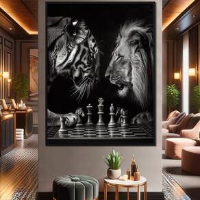 Quadro Decorativo Xadrez Felino Moldura Branca e Vidro - 150x100cm -