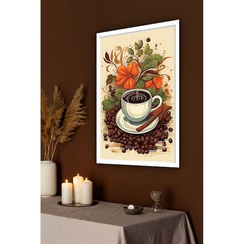Quadro Decorativo Xícara De Café Com Flores - 70x50cm - Cor: Moldura Branca