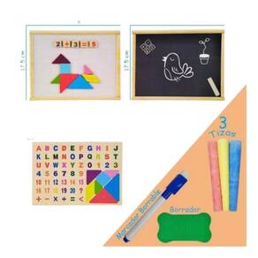 Quadro didático duplo com abaco: O quadro educacional de madeira, é um brinquedo educativo para crianças, contém 2 superfícies de trabalho, uma face a trabalhar com giz e borracha. E o segundo, quadro magnético para trabalhar com penugem e inclui acessórios Magnéticos como números e letras (entre outros) Brinquedo interativo para trabalhar com meninos e meninas Operações matemáticas simples e estimular o desenvolvimento do pensamento matemático em família, graças ao fato de conter um ábaco, aquele que facilitará o caminho nos primeiros passos no mundo da matemática. Cada conjunto inclui: 1 ardósia dupla, um lado magnético e escrita a giz Outro lado 1 Abaco Wood multicolorida 1 pluma de quadro-negro com borracha incluída na tampa 1 borracha para giz 1 caixa com 3 gizes (branco, vermelho e azul) 54 peças magnéticas entre (alfabeto e números) 7 peças magnéticas para montar figuras como tangrama. Medidas aproximadas: Ardósia dupla: 23x18cm. Abaco: 24cm x 20cm\ nMaterial principal: MaderCor: Multicolorido\ NRecomendado: a partir dos 3 anos\ nNão tóxico