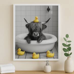 Quadro Divertido Banheiro Boi Com Patinhos 45x34cm - com vidro - Cor: Moldura branca