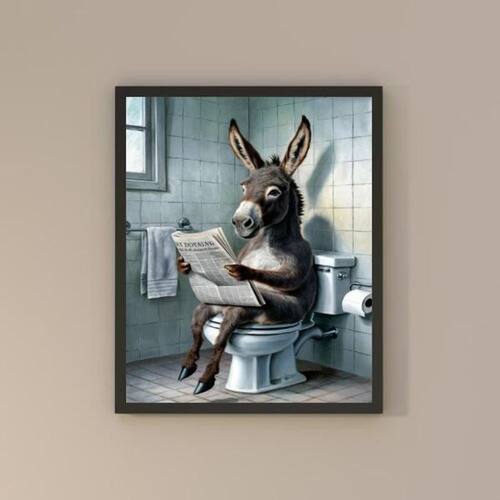 Quadro divertido banheiro burro lendo jornal 24x18cm - com vidro Cor: moldura branca Informações do produto tire todas as suas dúvidas no descritivo abaixo: decoração para quarto, sala, cozinha, escritório, área gourmet e muito mais. Chega de paredes vazias medidas - cada peça tem 24x18cm a5 . Material do papel - papel fotográfico brilhante de altíssima resolução acabamento - todos os quadros são acompanhados de vidro para proteção da imagem. - moldura em madeira maciça na cor preta ou branca conforme produto escolhido e pendurador . - os quadros são embalados de forma segura com plástico bolha com camada dupla de acordo com o tamanho dos quadros. Garantia - garantia de 3 meses. Meu quadro chegou. Como posso fixá-lo Você precisa apenas de um martelo e um prego, pois os quadros já vão acompanhados de penduradores. Esta é a forma mais indicada. Como posso limpar meu quadro A limpeza é feita como um móvel comum da sua casa. Apenas um pano seco ou espanador são suficientes para tal
