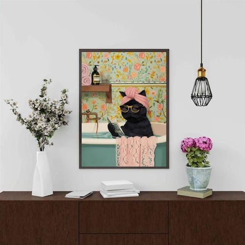 Quadro divertido banheiro - gatinha 33x24cm Cor: moldura branca Informações do produto tire todas as suas dúvidas no descritivo abaixo: decoração para quarto, sala, cozinha, escritório, área gourmet e muito mais. Chega de paredes vazias medidas - cada peça tem 33x24cm a4 . Material do papel - papel fotográfico brilhante de altíssima resolução acabamento - todos os quadros são acompanhados de uma película de acetato para proteção da imagem. - os quadros são embalados de forma segura com plástico bolha com camada dupla de acordo com o tamanho dos quadros. Garantia - garantia de 3 meses. Meu quadro chegou. Como posso fixá-lo Você precisa apenas de um martelo e um prego, pois os quadros já vão acompanhados de penduradores. Esta é a forma mais indicada. Caso prefira, você pode utilizar uma fita dupla face neste caso, sugerimos de alta qualidade para evitar que descole e seu quadro caia . Como posso limpar meu quadro A limpeza é feita como um móvel comum da sua casa. Apenas um pano seco ou espanador são suficientes para tal