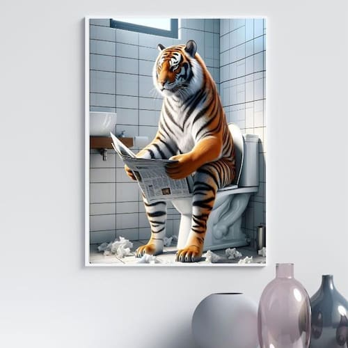 Quadro divertido banheiro - tigre 33x24cm Cor: moldura preta Informações do produto tire todas as suas dúvidas no descritivo abaixo: decoração para quarto, sala, cozinha, escritório, área gourmet e muito mais. Chega de paredes vazias medidas - cada peça tem 33x24cm a4 . Material do papel - papel fotográfico brilhante de altíssima resolução acabamento - todos os quadros são acompanhados de uma película de acetato para proteção da imagem. - os quadros são embalados de forma segura com plástico bolha com camada dupla de acordo com o tamanho dos quadros. Garantia - garantia de 3 meses. Meu quadro chegou. Como posso fixá-lo Você precisa apenas de um martelo e um prego, pois os quadros já vão acompanhados de penduradores. Esta é a forma mais indicada. Caso prefira, você pode utilizar uma fita dupla face neste caso, sugerimos de alta qualidade para evitar que descole e seu quadro caia . Como posso limpar meu quadro A limpeza é feita como um móvel comum da sua casa. Apenas um pano seco ou espanador são suficientes para tal