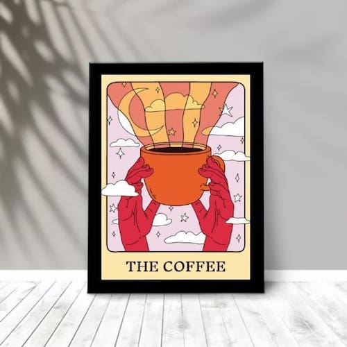 Quadro divertido café - tarot 24x18cm - com vidro Cor: moldura preta Informações do produto tire todas as suas dúvidas no descritivo abaixo: decoração para quarto, sala, cozinha, escritório, área gourmet e muito mais. Chega de paredes vazias medidas - cada peça tem 24x18cm a5 . Material do papel - papel fotográfico brilhante de altíssima resolução acabamento - todos os quadros são acompanhados de vidro para proteção da imagem. - moldura em madeira maciça na cor preta ou branca conforme produto escolhido e pendurador . - os quadros são embalados de forma segura com plástico bolha com camada dupla de acordo com o tamanho dos quadros. Garantia - garantia de 3 meses. Meu quadro chegou. Como posso fixá-lo Você precisa apenas de um martelo e um prego, pois os quadros já vão acompanhados de penduradores. Esta é a forma mais indicada. Como posso limpar meu quadro A limpeza é feita como um móvel comum da sua casa. Apenas um pano seco ou espanador são suficientes para tal