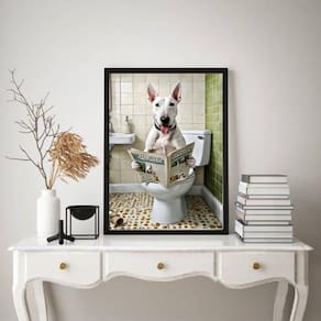 Quadro divertido de banheiro - bull terrier jornal 45x34cm Cor: moldura preta Informações do produto tire todas as suas dúvidas no descritivo abaixo: decoração para quarto, sala, cozinha, escritório, área gourmet e muito mais. Chega de paredes vazias. Medidas - cada peça tem 45x34cm a3 . Material do papel - papel fotográfico brilhante de altíssima resolução acabamento - todos os quadros são acompanhados de uma película de acetato para proteção da imagem. - os quadros são embalados de forma segura com plástico bolha com camada dupla de acordo com o tamanho dos quadros. - de 3 meses. Meu quadro chegou. Como posso fixá-lo Você precisa apenas de um martelo e um prego, pois os quadros já vão acompanhados de penduradores. Esta é a forma mais indicada. Caso prefira, você pode utilizar uma fita dupla face neste caso, sugerimos de alta qualidade para evitar que descole e seu quadro caia . Como posso limpar meu quadro A limpeza é feita como um móvel comum da sua casa. Apenas um pano seco ou espanador são suficientes para tal