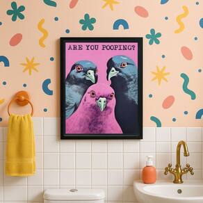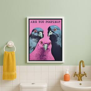 Quadro Divertido Para Banheiro Pombos Pooping 24x18cm - Cor: Moldura branca