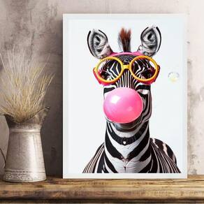 Quadro divertido zebra bubble gum 24x18cm - com vidro Cor: moldura branca Informações do produto tire todas as suas dúvidas no descritivo abaixo: decoração para quarto, sala, cozinha, escritório, área gourmet e muito mais. Chega de paredes vazias medidas - cada peça tem 24x18cm a5 . Material do papel - papel fotográfico brilhante de altíssima resolução acabamento - todos os quadros são acompanhados de vidro para proteção da imagem. - moldura em madeira maciça na cor preta ou branca conforme produto escolhido e pendurador . - os quadros são embalados de forma segura com plástico bolha com camada dupla de acordo com o tamanho dos quadros. Garantia - garantia de 3 meses. Meu quadro chegou. Como posso fixá-lo Você precisa apenas de um martelo e um prego, pois os quadros já vão acompanhados de penduradores. Esta é a forma mais indicada. Como posso limpar meu quadro A limpeza é feita como um móvel comum da sua casa. Apenas um pano seco ou espanador são suficientes para tal