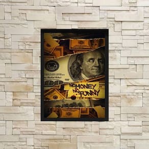 Quadro decorativo dollar no money, no funny 33x24cm - com vidro Moldura: madeira preta Informações do produto Decoração para quarto, sala, cozinha, escritório, área gourmet e muito mais. Chega de paredes vazias medidas - cada peça tem 33x24cm a4 . Material do papel - papel fotográfico brilhante de altíssima resolução Acabamento - todos os quadros são acompanhados de vidro para proteção da imagem. - Moldura em madeira maciça na cor preta e pendurador . - Os quadros são embalados de forma segura com plástico bolha com camada dupla de acordo com o tamanho dos quadros. - de 3 meses. Meu quadro chegou. Como posso fixá-lo Você precisa apenas de um martelo e um prego, pois os quadros já vão acompanhados de penduradores. Esta é a forma mais indicada. Como posso limpar meu quadro A limpeza é feita como um móvel comum da sua casa. Apenas um pano seco ou espanador são suficientes para tal Ean: 7895142207881