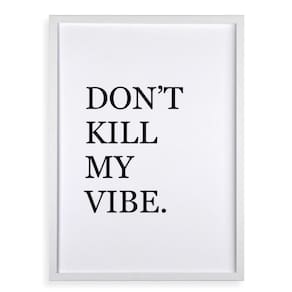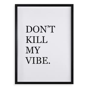 Quadro don't kill my vibe 33x24cm Cor: moldura preta Informações do produto tire todas as suas dúvidas no descritivo abaixo: decoração para quarto, sala, cozinha, escritório, área gourmet e muito mais. Chega de paredes vazias medidas - cada peça tem 33x24cm a4 . Material do papel - papel fotográfico brilhante de altíssima resolução acabamento - todos os quadros são acompanhados de uma película de acetato para proteção da imagem. - os quadros são embalados de forma segura com plástico bolha com camada dupla de acordo com o tamanho dos quadros. - de 3 meses. Meu quadro chegou. Como posso fixá-lo Você precisa apenas de um martelo e um prego, pois os quadros já vão acompanhados de penduradores. Esta é a forma mais indicada. Caso prefira, você pode utilizar uma fita dupla face neste caso, sugerimos de alta qualidade para evitar que descole e seu quadro caia . Como posso limpar meu quadro A limpeza é feita como um móvel comum da sua casa. Apenas um pano seco ou espanador são suficientes para tal