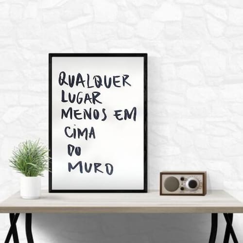 Quadro em cima do muro não 33x24cm - com vidro Cor: moldura preta Informações do produto tire todas as suas dúvidas no descritivo abaixo: decoração para quarto, sala, cozinha, escritório, área gourmet e muito mais. Chega de paredes vazias medidas - cada peça tem 33x24cm a4 . Material do papel - papel fotográfico brilhante de altíssima resolução acabamento - todos os quadros são acompanhados de vidro para proteção da imagem. - moldura em madeira maciça na cor preta ou branca conforme produto escolhido e pendurador . - os quadros são embalados de forma segura com plástico bolha com camada dupla de acordo com o tamanho dos quadros. Garantia - garantia de 3 meses. Meu quadro chegou. Como posso fixá-lo Você precisa apenas de um martelo e um prego, pois os quadros já vão acompanhados de penduradores. Esta é a forma mais indicada. Como posso limpar meu quadro A limpeza é feita como um móvel comum da sua casa. Apenas um pano seco ou espanador são suficientes para tal