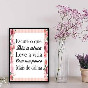 Quadro escute o que diz a alma 33x24cm Moldura: madeira preta Informações do produto tire todas as suas dúvidas no descritivo abaixo: decoração para quarto, sala, cozinha, escritório, área gourmet e muito mais. Chega de paredes vazias medidas - cada peça tem 33x24cm a4 . Material do papel - papel fotográfico brilhante de altíssima resolução acabamento - todos os quadros são acompanhados de uma película de acetato para proteção da imagem. - os quadros são embalados de forma segura com plástico bolha com camada dupla de acordo com o tamanho dos quadros. - de 3 meses. Meu quadro chegou. Como posso fixá-lo Você precisa apenas de um martelo e um prego, pois os quadros já vão acompanhados de penduradores. Esta é a forma mais indicada. Caso prefira, você pode utilizar uma fita dupla face neste caso, sugerimos de alta qualidade para evitar que descole e seu quadro caia . Como posso limpar meu quadro A limpeza é feita como um móvel comum da sua casa. Apenas um pano seco ou espanador são suficientes para tal Marca: Não Informado Ean: 7896719823688