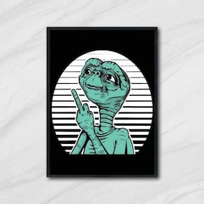 Quadro et mostrando o dedo 33x24cm - com vidro Moldura: madeira preta Informações do produto tire todas as suas dúvidas no descritivo abaixo: decoração para quarto, sala, cozinha, escritório, área gourmet e muito mais. Chega de paredes vazias medidas - cada peça tem 33x24cm a4 . Material do papel - papel fotográfico brilhante de altíssima resolução acabamento - todos os quadros são acompanhados de vidro para proteção da imagem. - moldura em madeira maciça na cor preta e pendurador . - os quadros são embalados de forma segura com plástico bolha com camada dupla de acordo com o tamanho dos quadros. - de 3 meses. Meu quadro chegou. Como posso fixá-lo Você precisa apenas de um martelo e um prego, pois os quadros já vão acompanhados de penduradores. Esta é a forma mais indicada. Como posso limpar meu quadro A limpeza é feita como um móvel comum da sua casa. Apenas um pano seco ou espanador são suficientes para tal