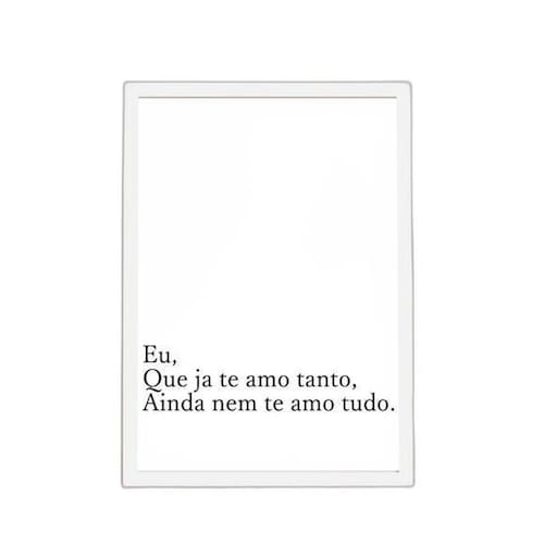 Quadro eu que já te amo tanto 33x24cm - com vidro Moldura: madeira branca Informações do produto tire todas as suas dúvidas no descritivo abaixo: decoração para quarto, sala, cozinha, escritório, área gourmet e muito mais. Chega de paredes vazias medidas - cada peça tem 33x24cm a4 . Material do papel - papel fotográfico brilhante de altíssima resolução acabamento - todos os quadros são acompanhados de vidro para proteção da imagem. - moldura em madeira maciça na cor preta e pendurador . - os quadros são embalados de forma segura com plástico bolha com camada dupla de acordo com o tamanho dos quadros. - de 3 meses. Meu quadro chegou. Como posso fixá-lo Você precisa apenas de um martelo e um prego, pois os quadros já vão acompanhados de penduradores. Esta é a forma mais indicada. Como posso limpar meu quadro A limpeza é feita como um móvel comum da sua casa. Apenas um pano seco ou espanador são suficientes para tal Ean: 7895142242974
