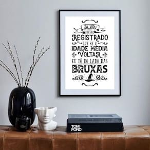 Quadro eu tô do lado das bruxas - 60x48cm Moldura: madeira preta Informações do produto tire todas as suas dúvidas no descritivo abaixo: decoração para quarto, sala, cozinha, escritório, área gourmet e muito mais. Chega de paredes vazias medidas - cada peça tem 60x48cm . Material do papel - papel fotográfico brilhante de altíssima resolução acabamento - todos os quadros são acompanhados de vidro para proteção da imagem. - moldura em madeira maciça na cor preta ou branca conforme produto escolhido e pendurador. - paspatur branco com 7cm de largura - os quadros são embalados de forma segura com plástico bolha com camada dupla de acordo com o tamanho dos quadros. - de 3 meses. Meu quadro chegou. Como posso fixá-lo Você precisa apenas de um martelo e um prego, pois os quadros já vão acompanhados de penduradores. Esta é a forma mais indicada. Como posso limpar meu quadro A limpeza é feita como um móvel comum da sua casa. Apenas um pano seco ou espanador são suficientes para tal
