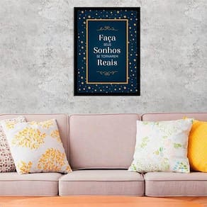 Quadro faça seus sonhos se tornarem reais 33x24cm - com vidro Moldura: madeira preta Informações do produto tire todas as suas dúvidas no descritivo abaixo: decoração para quarto, sala, cozinha, escritório, área gourmet e muito mais. Chega de paredes vazias medidas - cada peça tem 33x24cm a4 . Material do papel - papel fotográfico brilhante de altíssima resolução acabamento - todos os quadros são acompanhados de vidro para proteção da imagem. - moldura em madeira maciça na cor preta e pendurador . - os quadros são embalados de forma segura com plástico bolha com camada dupla de acordo com o tamanho dos quadros. Garantia - garantia de 3 meses. Meu quadro chegou. Como posso fixá-lo Você precisa apenas de um martelo e um prego, pois os quadros já vão acompanhados de penduradores. Esta é a forma mais indicada. Como posso limpar meu quadro A limpeza é feita como um móvel comum da sua casa. Apenas um pano seco ou espanador são suficientes para tal Ean: 7895142227223
