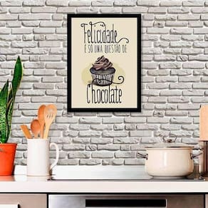 Quadro felicidade é só uma questão de chocolate 24x18cm - com vidro Moldura: madeira preta Informações do produto tire todas as suas dúvidas no descritivo abaixo: decoração para quarto, sala, cozinha, escritório, área gourmet e muito mais. Chega de paredes vazias medidas - cada peça tem 24x18cm a5 . Material do papel - papel fotográfico brilhante de altíssima resolução acabamento - todos os quadros são acompanhados de vidro para proteção da imagem. - moldura em madeira maciça na cor preta e pendurador . - os quadros são embalados de forma segura com plástico bolha com camada dupla de acordo com o tamanho dos quadros. - de 3 meses. Meu quadro chegou. Como posso fixá-lo Você precisa apenas de um martelo e um prego, pois os quadros já vão acompanhados de penduradores. Esta é a forma mais indicada. Como posso limpar meu quadro A limpeza é feita como um móvel comum da sua casa. Apenas um pano seco ou espanador são suficientes para tal Marca: Não Informado