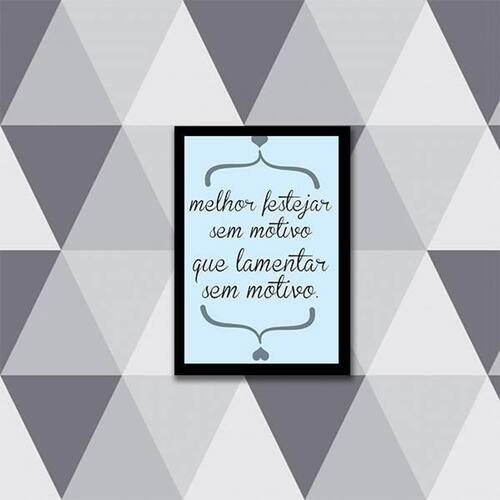 Quadro melhor festejar sem motivo que lamentar sem motivo 33x24cm - com vidro Moldura: madeira preta Informações do produto tire todas as suas dúvidas no descritivo abaixo: decoração para quarto, sala, cozinha, escritório, área gourmet e muito mais. Chega de paredes vazias medidas - cada peça tem 33x24cm a4 . Material do papel - papel fotográfico brilhante de altíssima resolução acabamento - todos os quadros são acompanhados de vidro para proteção da imagem. - moldura em madeira maciça na cor preta e pendurador . - os quadros são embalados de forma segura com plástico bolha com camada dupla de acordo com o tamanho dos quadros. - de 3 meses. Meu quadro chegou. Como posso fixá-lo Você precisa apenas de um martelo e um prego, pois os quadros já vão acompanhados de penduradores. Esta é a forma mais indicada. Como posso limpar meu quadro A limpeza é feita como um móvel comum da sua casa. Apenas um pano seco ou espanador são suficientes para tal Marca: Não Informado