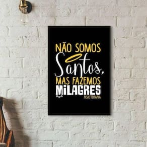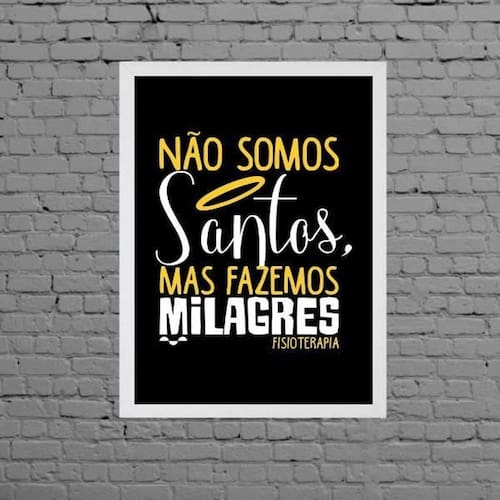 Quadro fisioterapia não somos santos 33x24cm - com vidro Moldura: madeira preta Informações do produto tire todas as suas dúvidas no descritivo abaixo: decoração para quarto, sala, cozinha, escritório, área gourmet e muito mais. Chega de paredes vazias medidas - cada peça tem 33x24cm a4 . Material do papel - papel fotográfico brilhante de altíssima resolução acabamento - todos os quadros são acompanhados de vidro para proteção da imagem. - moldura em madeira maciça na cor preta e pendurador . - os quadros são embalados de forma segura com plástico bolha com camada dupla de acordo com o tamanho dos quadros. - de 3 meses. Meu quadro chegou. Como posso fixá-lo Você precisa apenas de um martelo e um prego, pois os quadros já vão acompanhados de penduradores. Esta é a forma mais indicada. Como posso limpar meu quadro A limpeza é feita como um móvel comum da sua casa. Apenas um pano seco ou espanador são suficientes para tal