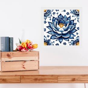 Quadro Flor De Lotus Estilo Azulejo Português - 33x33cm - Cor: Moldura Branca
