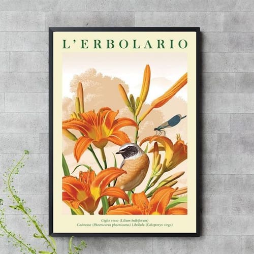 Quadro floral laranja com passarinho 33x24cm