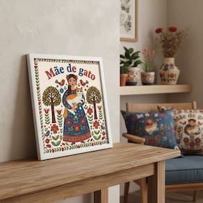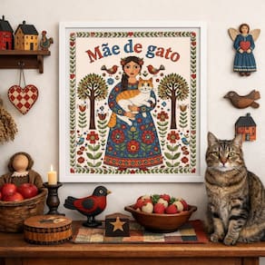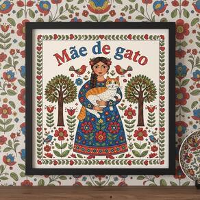 Quadro Folk Art Mãe de Gato 33x33cm Mold Branca