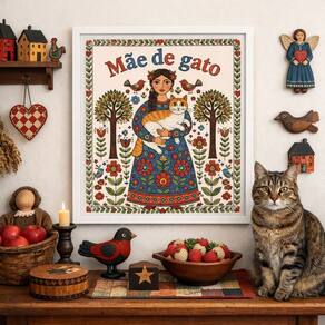Quadro Folk Art Mãe de Gato 33x33cm Mold Preta