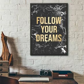 Quadro follow your dreams mármore 33x24cm - com vidro Moldura: madeira preta Informações do produto tire todas as suas dúvidas no descritivo abaixo: decoração para quarto, sala, cozinha, escritório, área gourmet e muito mais. Chega de paredes vazias medidas - cada peça tem 33x24cm a4 . Material do papel - papel fotográfico brilhante de altíssima resolução acabamento - todos os quadros são acompanhados de vidro para proteção da imagem. - moldura em madeira maciça na cor preta e pendurador . - os quadros são embalados de forma segura com plástico bolha com camada dupla de acordo com o tamanho dos quadros. - de 3 meses. Meu quadro chegou. Como posso fixá-lo Você precisa apenas de um martelo e um prego, pois os quadros já vão acompanhados de penduradores. Esta é a forma mais indicada. Como posso limpar meu quadro A limpeza é feita como um móvel comum da sua casa. Apenas um pano seco ou espanador são suficientes para tal Ean: 7895142248020