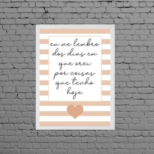 Quadro frase dias em que orei 33x24cm - com vidro Moldura: madeira preta Informações do produto tire todas as suas dúvidas no descritivo abaixo: decoração para quarto, sala, cozinha, escritório, área gourmet e muito mais. Chega de paredes vazias medidas - cada peça tem 33x24cm a4 . Material do papel - papel fotográfico brilhante de altíssima resolução acabamento - todos os quadros são acompanhados de vidro para proteção da imagem. - moldura em madeira maciça na cor preta e pendurador . - os quadros são embalados de forma segura com plástico bolha com camada dupla de acordo com o tamanho dos quadros. Garantia - garantia de 3 meses. Meu quadro chegou. Como posso fixá-lo Você precisa apenas de um martelo e um prego, pois os quadros já vão acompanhados de penduradores. Esta é a forma mais indicada. Como posso limpar meu quadro A limpeza é feita como um móvel comum da sua casa. Apenas um pano seco ou espanador são suficientes para tal Ean: 7895142248808