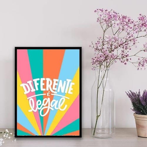 Quadro frase diferente é legal 45x34cm Moldura: madeira preta Informações do produto tire todas as suas dúvidas no descritivo abaixo: decoração para quarto, sala, cozinha, escritório, área gourmet e muito mais. Chega de paredes vazias. Medidas - cada peça tem 45x34cm a3 . Material do papel - papel fotográfico brilhante de altíssima resolução acabamento - todos os quadros são acompanhados de uma película de acetato para proteção da imagem. - moldura em madeira maciça na cor preta e pendurador móvel que pode ser retirado facilmente caso deseje fixar com fita dupla face. - os quadros são embalados de forma segura com plástico bolha com camada dupla de acordo com o tamanho dos quadros. Garantia - garantia de 3 meses. Meu quadro chegou. Como posso fixá-lo Você precisa apenas de um martelo e um prego, pois os quadros já vão acompanhados de penduradores. Esta é a forma mais indicada. Caso prefira, você pode utilizar uma fita dupla face neste caso, sugerimos de alta qualidade para evitar que descole e seu quadro caia . Como posso limpar meu quadro A limpeza é feita como um móvel comum da sua casa. Apenas um pano seco ou espanador são suficientes para tal