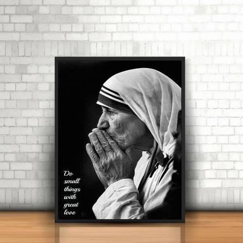 Quadro frase madre teresa de calcutá 33x24cm Moldura: madeira preta Informações do produto tire todas as suas dúvidas no descritivo abaixo: decoração para quarto, sala, cozinha, escritório, área gourmet e muito mais. Chega de paredes vazias medidas - cada peça tem 33x24cm a4 . Material do papel - papel fotográfico brilhante de altíssima resolução acabamento - todos os quadros são acompanhados de uma película de acetato para proteção da imagem. - moldura em madeira maciça na cor preta e pendurador móvel que pode ser retirado facilmente caso deseje fixar com fita dupla face. - os quadros são embalados de forma segura com plástico bolha com camada dupla de acordo com o tamanho dos quadros. Ean: 7892091108566