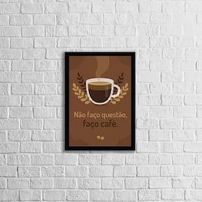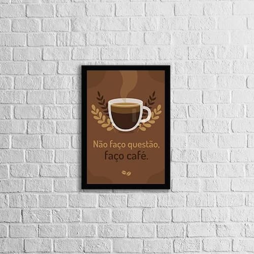 Quadro frase não faço questão, faço café 24x18cm Moldura: madeira preta Informações do produto tire todas as suas dúvidas no descritivo abaixo: decoração para quarto, sala, cozinha, escritório, área gourmet e muito mais. Chega de paredes vazias medidas - cada peça tem 24x18cm a5 . Material do papel - papel fotográfico brilhante de altíssima resolução acabamento - todos os quadros são acompanhados de uma película de acetato para proteção da imagem. - moldura em madeira maciça na cor branca e pendurador móvel que pode ser retirado facilmente caso deseje fixar com fita dupla face. - os quadros são embalados de forma segura com plástico bolha com camada dupla de acordo com o tamanho dos quadros. Garantia - garantia de 3 meses prazo de envio pedimos 24 horas úteis no máximo para enviar seu pedido após o envio, segue os prazos normais dos correios, cerca de 7 dias úteis exceto para norte e nordeste, que pode ser de até 14 dias úteis. Em diversas cidades, este prazo normalmente é reduzido, mas depende do prazo dos correios. Meu quadro chegou. Como posso fixá-lo Você precisa apenas de um martelo e um prego, pois os quadros já vão acompanhados de penduradores. Esta é a forma mais indicada. Caso prefira, você pode utilizar uma fita dupla face neste caso, sugerimos de alta qualidade para evitar que descole e seu quadro caia . Como posso limpar meu quadro A limpeza é feita como um móvel comum da sua casa. Apenas um pano seco ou espanador são suficientes para tal Ean: 7892090488805