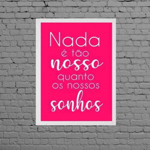 Quadro frase nossos sonhos pink 45x34cm - com vidro Moldura: madeira branca Informações do produto tire todas as suas dúvidas no descritivo abaixo: decoração para quarto, sala, cozinha, escritório, área gourmet e muito mais. Chega de paredes vazias medidas - cada peça tem 45x34cm a3 . Material do papel - papel fotográfico brilhante de altíssima resolução acabamento - todos os quadros são acompanhados de vidro para proteção da imagem. - moldura em madeira maciça na cor preta e pendurador . - os quadros são embalados de forma segura com plástico bolha com camada dupla de acordo com o tamanho dos quadros. - de 3 meses. Meu quadro chegou. Como posso fixá-lo Você precisa apenas de um martelo e um prego, pois os quadros já vão acompanhados de penduradores. Esta é a forma mais indicada. Como posso limpar meu quadro A limpeza é feita como um móvel comum da sua casa. Apenas um pano seco ou espanador são suficientes para tal Marca: Não Informado