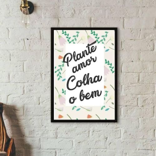 Quadro frase plante amor colha o bem 24x18cm - com vidro Moldura: madeira preta Informações do produto Decoração para quarto, sala, cozinha, escritório, área gourmet e muito mais. Chega de paredes vazias Medidas - cada peça tem 24x18cm a5 . Material do papel - papel fotográfico brilhante de altíssima resolução Acabamento - todos os quadros são acompanhados de vidro para proteção da imagem. - Moldura em madeira maciça na cor preta e pendurador. - Os quadros são embalados de forma segura com plástico bolha com camada dupla de acordo com o tamanho dos quadros. - de 3 meses. Meu quadro chegou. Como posso fixá-lo Você precisa apenas de um martelo e um prego, pois os quadros já vão acompanhados de penduradores. Esta é a forma mais indicada. Como posso limpar meu quadro A limpeza é feita como um móvel comum da sua casa. Apenas um pano seco ou espanador são suficientes para tal Marca: Não Informado