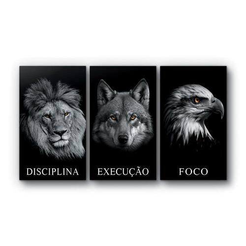 Mensagens Motivacionais: Cada quadro apresenta uma representação única e inspiradora: o leão, símbolo de disciplina; o lobo, representando execução; e a águia, simbolizando foco. As palavras disciplina, execução e foco são estrategicamente associadas a cada imagem, tornando este painel não apenas uma obra de arte, mas também uma fonte diária de motivação e força interior.