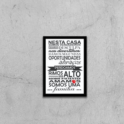 Quadro frases sobre família 24x18cm Moldura: madeira preta Informações do produto tire todas as suas dúvidas no descritivo abaixo: decoração para quarto, sala, cozinha, escritório, área gourmet e muito mais. Chega de paredes vazias medidas - cada peça tem 24x18cm a5 . Material do papel - papel fotográfico brilhante de altíssima resolução acabamento - todos os quadros são acompanhados de uma película de acetato para proteção da imagem. - moldura em madeira maciça na cor branca e pendurador móvel que pode ser retirado facilmente caso deseje fixar com fita dupla face. - os quadros são embalados de forma segura com plástico bolha com camada dupla de acordo com o tamanho dos quadros. - de 3 meses prazo de envio pedimos 24 horas úteis no máximo para enviar seu pedido após o envio, segue os prazos normais dos correios, cerca de 7 exceto para norte e nordeste, que pode ser de até 14 . Em diversas cidades, este prazo normalmente é reduzido, mas depende do prazo dos correios. Meu quadro chegou. Como posso fixá-lo Você precisa apenas de um martelo e um prego, pois os quadros já vão acompanhados de penduradores. Esta é a forma mais indicada. Caso prefira, você pode utilizar uma fita dupla face neste caso, sugerimos de alta qualidade para evitar que descole e seu quadro caia . Como posso limpar meu quadro A limpeza é feita como um móvel comum da sua casa. Apenas um pano seco ou espanador são suficientes para tal Marca: Não Informado