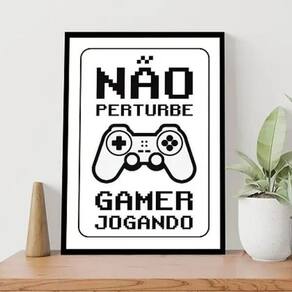 Quadro gamer jogando não perturbe 33x24cm Moldura: madeira preta Informações do produto tire todas as suas dúvidas no descritivo abaixo: decoração para quarto, sala, cozinha, escritório, área gourmet e muito mais. Chega de paredes vazias medidas - cada peça tem 33x24cm a4 . Material do papel - papel fotográfico brilhante de altíssima resolução acabamento - todos os quadros são acompanhados de uma película de acetato para proteção da imagem. - os quadros são embalados de forma segura com plástico bolha com camada dupla de acordo com o tamanho dos quadros. Você precisa apenas de um martelo e um prego, pois os quadros já vão acompanhados de penduradores. Esta é a forma mais indicada. Caso prefira, você pode utilizar uma fita dupla face neste caso, sugerimos de alta qualidade para evitar que descole e seu quadro caia . Como posso limpar meu quadro A limpeza é feita como um móvel comum da sua casa. Apenas um pano seco ou espanador são suficientes para tal Marca: Não Informado