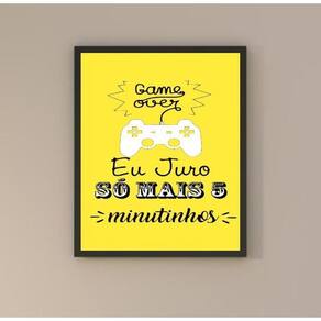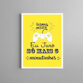 Quadro gamer - só mais 5 minutos 24x18cm Cor: moldura branca Informações do produto tire todas as suas dúvidas no descritivo abaixo: decoração para quarto, sala, cozinha, escritório, área gourmet e muito mais. Chega de paredes vazias medidas - cada peça tem 24x18cm a5 . Material do papel - papel fotográfico brilhante de altíssima resolução acabamento - todos os quadros são acompanhados de uma película de acetato para proteção da imagem. - os quadros são embalados de forma segura com plástico bolha com camada dupla de acordo com o tamanho dos quadros. Garantia - garantia de 3 meses. Meu quadro chegou. Como posso fixá-lo Você precisa apenas de um martelo e um prego, pois os quadros já vão acompanhados de penduradores. Esta é a forma mais indicada. Caso prefira, você pode utilizar uma fita dupla face neste caso, sugerimos de alta qualidade para evitar que descole e seu quadro caia . Como posso limpar meu quadro A limpeza é feita como um móvel comum da sua casa. Apenas um pano seco ou espanador são suficientes para tal