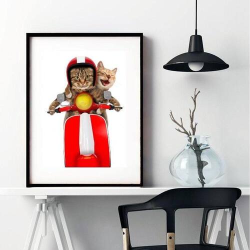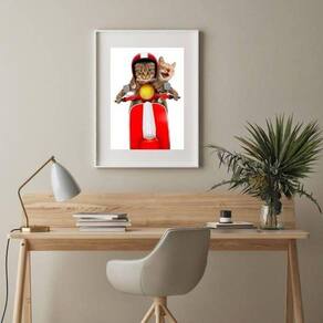 Quadro gatinhos na lambreta - 60x48cm Moldura: madeira branca Informações do produto tire todas as suas dúvidas no descritivo abaixo: decoração para quarto, sala, cozinha, escritório, área gourmet e muito mais. Chega de paredes vazias medidas - cada peça tem 60x48cm . Material do papel - papel fotográfico brilhante de altíssima resolução acabamento - todos os quadros são acompanhados de vidro para proteção da imagem. - moldura em madeira maciça na cor preta ou branca conforme produto escolhido e pendurador. - paspatur branco com 7cm de largura - os quadros são embalados de forma segura com plástico bolha com camada dupla de acordo com o tamanho dos quadros. Garantia - garantia de 3 meses. Meu quadro chegou. Como posso fixá-lo Você precisa apenas de um martelo e um prego, pois os quadros já vão acompanhados de penduradores. Esta é a forma mais indicada. Como posso limpar meu quadro A limpeza é feita como um móvel comum da sua casa. Apenas um pano seco ou espanador são suficientes para tal