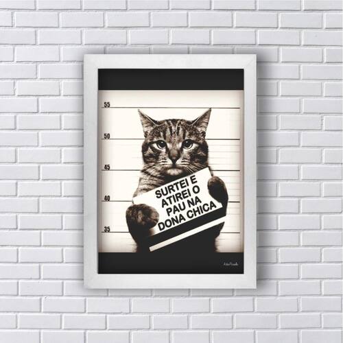 Quadro gato atirei o pau na dona chica 33x24cm Moldura: madeira branca Informações do produto Decoração para quarto, sala, cozinha, escritório, área gourmet e muito mais. Chega de paredes vazias Medidas - cada peça tem 33x24cm a4 . Material do papel - papel fotográfico brilhante de altíssima resolução Acabamento - todos os quadros são acompanhados de uma película de acetato para proteção da imagem. - os quadros são embalados de forma segura com plástico bolha com camada dupla de acordo com o tamanho dos quadros. - de 3 meses. Meu quadro chegou. Como posso fixá-lo Você precisa apenas de um martelo e um prego, pois os quadros já vão acompanhados de penduradores. Esta é a forma mais indicada. Caso prefira, você pode utilizar uma fita dupla face neste caso, sugerimos de alta qualidade para evitar que descole e seu quadro caia . Como posso limpar meu quadro A limpeza é feita como um móvel comum da sua casa. Apenas um pano seco ou espanador são suficientes para tal Marca: Não Informado Ean: 7895584528179