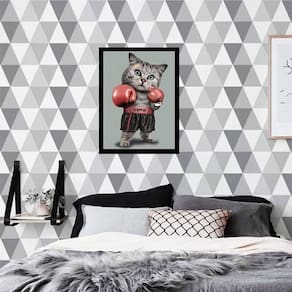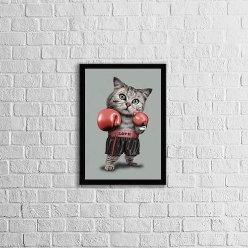 Quadro gato lutador de boxe 45x34cm - com vidro Moldura: madeira preta Informações do produto tire todas as suas dúvidas no descritivo abaixo: decoração para quarto, sala, cozinha, escritório, área gourmet e muito mais. Chega de paredes vazias medidas - cada peça tem 45x34cm a3 . Material do papel - papel fotográfico brilhante de altíssima resolução acabamento - todos os quadros são acompanhados de vidro para proteção da imagem. - moldura em madeira maciça na cor preta e pendurador . - os quadros são embalados de forma segura com plástico bolha com camada dupla de acordo com o tamanho dos quadros. - de 3 meses. Meu quadro chegou. Como posso fixá-lo Você precisa apenas de um martelo e um prego, pois os quadros já vão acompanhados de penduradores. Esta é a forma mais indicada. Como posso limpar meu quadro A limpeza é feita como um móvel comum da sua casa. Apenas um pano seco ou espanador são suficientes para tal Marca: Não Informado