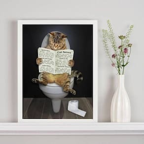 Quadro gato no banheiro lendo jornal 33x24cm - com vidro Moldura: madeira branca Informações do produto tire todas as suas dúvidas no descritivo abaixo: decoração para quarto, sala, cozinha, escritório, área gourmet e muito mais. Chega de paredes vazias medidas - cada peça tem 33x24cm a4 . Material do papel - papel fotográfico brilhante de altíssima resolução acabamento - todos os quadros são acompanhados de vidro para proteção da imagem. - moldura em madeira maciça na cor preta ou branca conforme produto escolhido e pendurador . - os quadros são embalados de forma segura com plástico bolha com camada dupla de acordo com o tamanho dos quadros. Garantia - garantia de 3 meses. Meu quadro chegou. Como posso fixá-lo Você precisa apenas de um martelo e um prego, pois os quadros já vão acompanhados de penduradores. Esta é a forma mais indicada. Como posso limpar meu quadro A limpeza é feita como um móvel comum da sua casa. Apenas um pano seco ou espanador são suficientes para tal